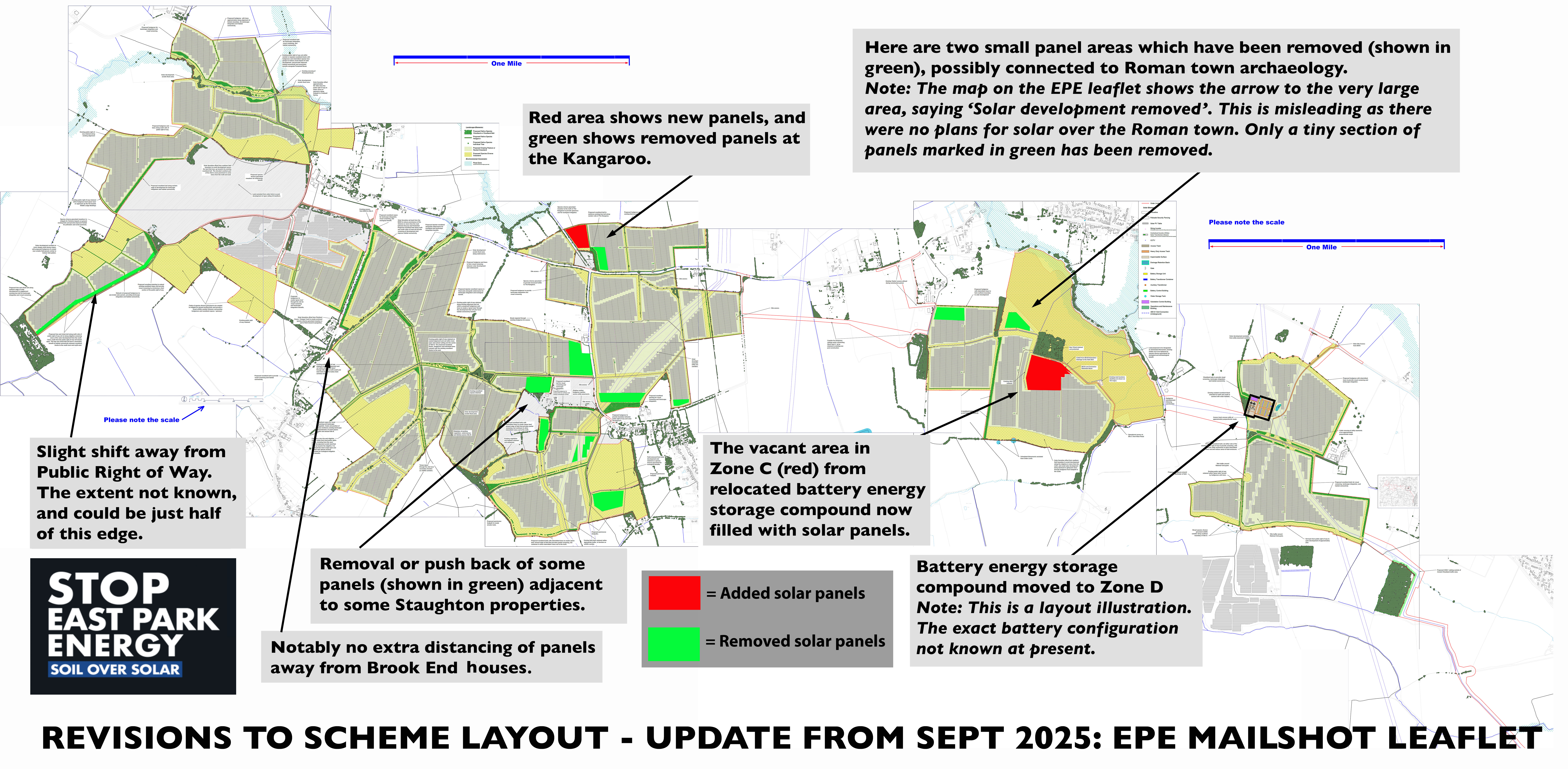 This plan shows the final site layout, and where solar panel arrays have been added or removed – it’s based on the developer’s September 2025 leaflet