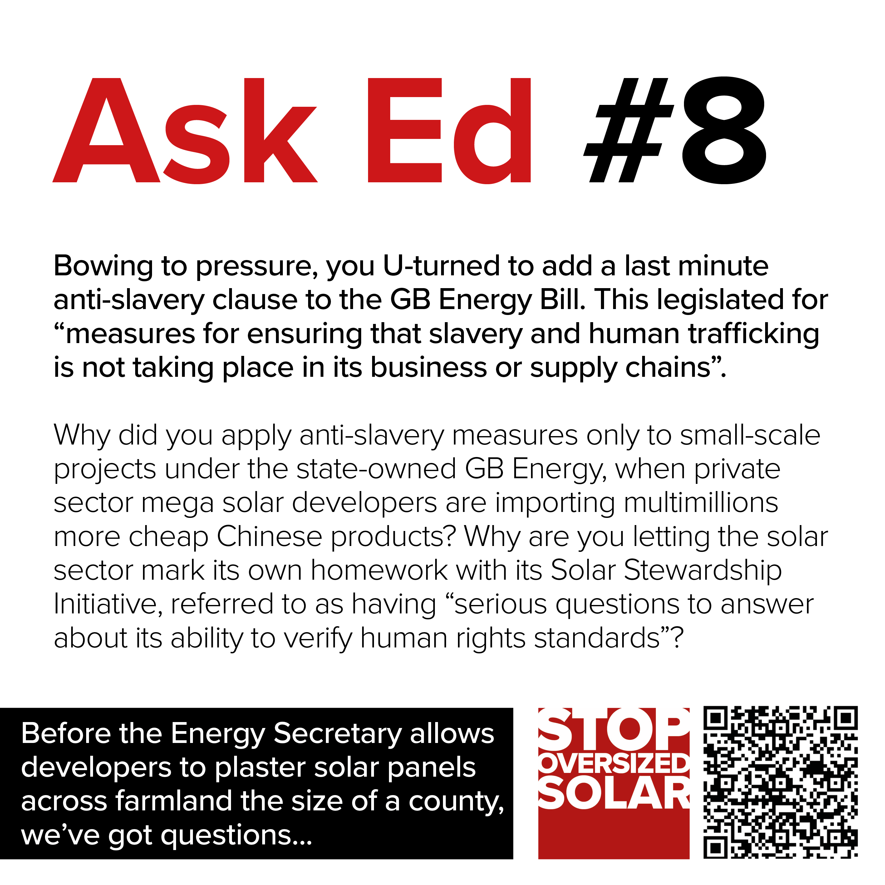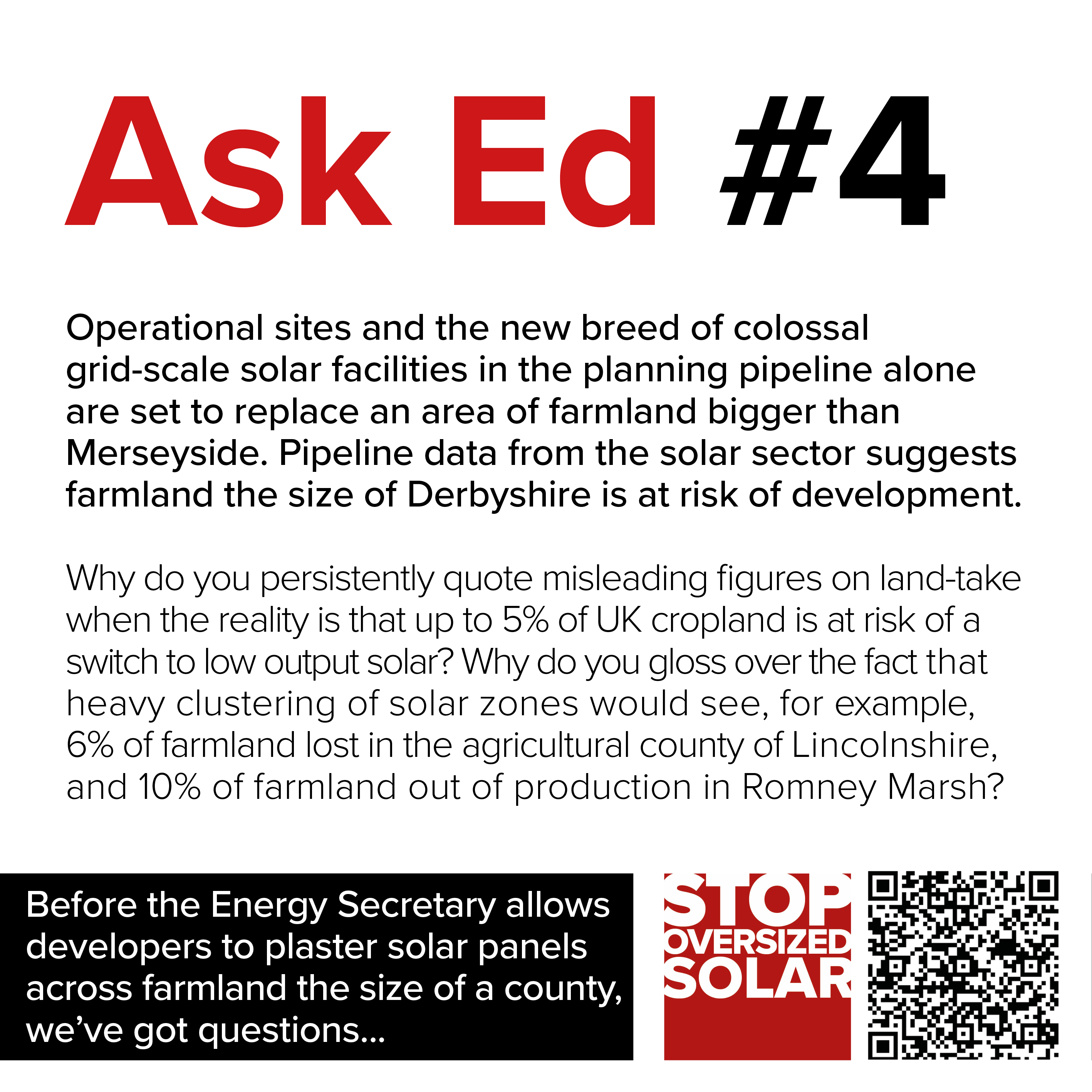 Before the Energy Secretary allows developers to carpet our countryside with solar panels covering farmland the size of a county we’ve got questions…